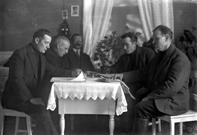 Tuurin osuuskaupan Hakojärven sivumyymälän myymäläneuvosto vs. Vihtori Katajamäki, asemamies August Alkula, myymälän kauppias Kalle Metsälä, Juho Lamminaho ja Erkki Kallioniemi Valokuvaaja Heikki Heikkola