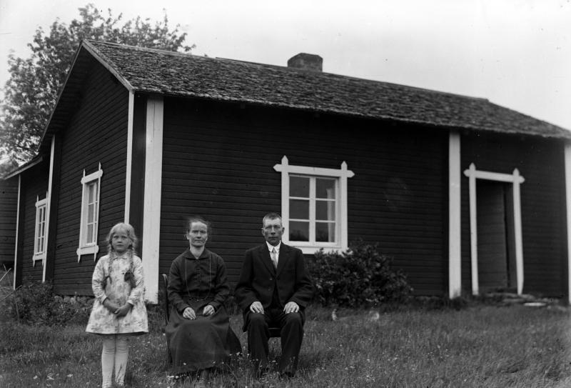 Hilma ja Edvin Lampila, ottotytär Annikki Heinälahti myöh. Pihlajasaari. Lampilan talo sijaitsi Töysän asemalta Ähtäriin päin noin 3 km, Hoikanlammen toisella puolella kallion kyljessä. Valokuvaaja Heikki Heikkola