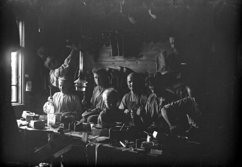 Töysän Mäkelän lapikastehdas, edessä vas. Aimo Mäkelä, Eino Lamminaho, poika Aapo Mäkelä, Eino Heinämäki, Hietamäki, Väinö Makiranta, takana Arvid Mäkelä, takana vas. Armo Mäkelä. Valokuvaaja Heikki Heikkola