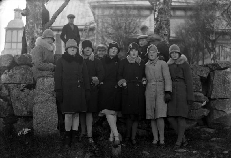 Rippikoululaisia Töysän kirkon kivimuurin vieressä