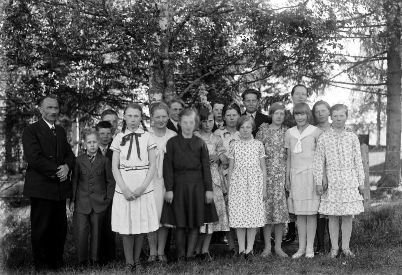 vas. opettaja Juho Hakala, Osmo Kanerva, Sulo Einola, takana oik. opettaja Aino Åkerman, Laina Pakkala, vas. lettipäinen tyttö Hilda Lähteenmaa, myöh. Moisio Valokuvaaja Heikki Heikkola