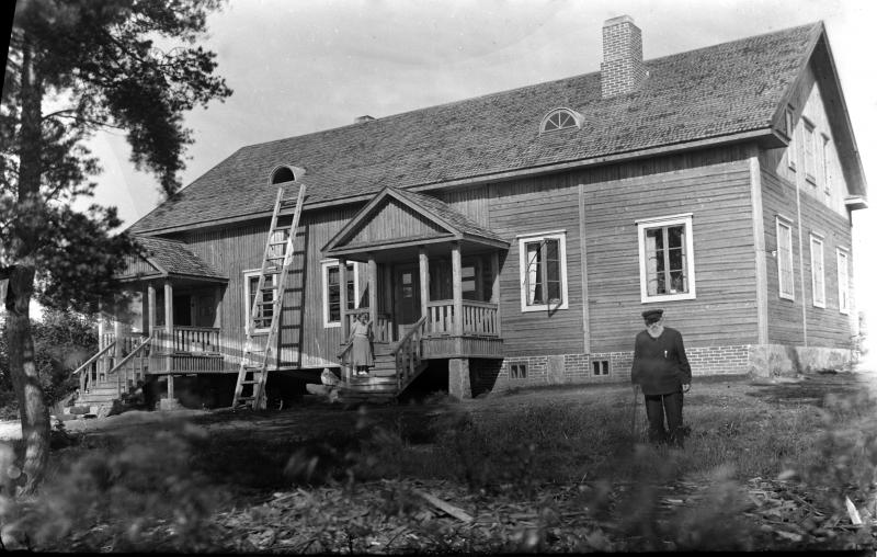 Töysän ensimmäinen kunnantalo Töysän Sankarihautaa vastapäätä. Kuvassa Annala, joka asui rakennuksen toisessa päässä ja hoiti kunnantalon siivoukset ja lämmitykset. Valokuvaaja Heikki Heikkola Kuvakoko 100x145