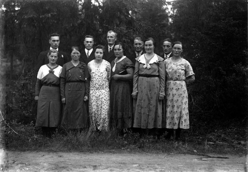 Vas. Lyyli Huutoniemi (nyk. Saarimäki), takana kesk. Vilho Huutoniemi, edessä oik. Hilma Ollikainen Miehet vas. Armas Haveri, Toivo Haveri, Niilo Koskituuri Valokuvaaja Heikki Heikkola