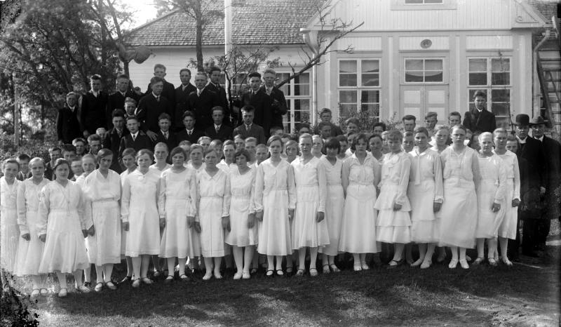 1914 syntyneet rippilapset Töysän pappilan edessä. Oikealla kirkkoherra Väinö Tuomola. Valokuvaaja Verner Vanhamäki