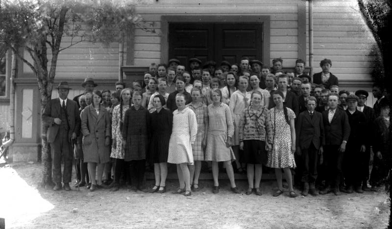 Rippikoululaisia Töysän kirkon edessä, vasemmalla kirkkoherra Väinö Tuomola Valokuvaaja Verner Vanhamäki