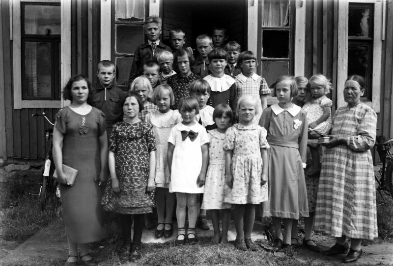 Edessä vas. Aino Kiviaho, Martta Moisio, Maija Yli-Mutka (myöh. Tuokkola), Linnea Kiviaho (myöh. Rauhala), Elli Annikki (kutsumanimi) Pihlajamäki (myöh. Männikkö), Irma Kiviaho (myöh. Kleimola), Anneli Hakola (myöh. Remahl), Mirja Pihlajamäki (myöh. Mäkinen), Eila Pihlajamäki, Rauni Hakola, Sylvi Kuurila (myöh. Vanhamäki), Anna-Kaisa Pihlajamäki. Keskirivissä Jaakko Kuurila, Jukka Moisio, Hermanni Yli-Mutka, Laina Moisio, Kyllikki Hakola (myöh. Kasteenpohja), Toini Saarimäki. Ylärvissä Otto Pihlajamäki, Olavi Kiviaho, Kalervo Kiviaho, Unto Onnela ja Aarne Räntilä. Kuva otettu Onnelan rappusilla 1940-luvulla.