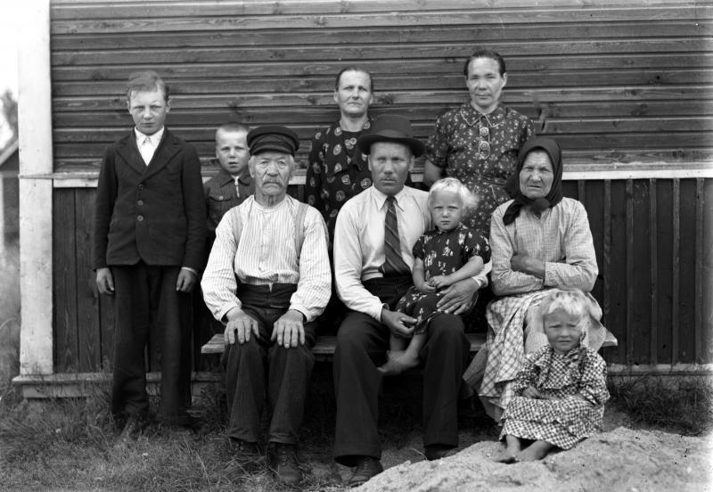 oik. taka Ruusa Ollikainen, keskellä Aini Mansikkamäki, Vas. Erkki Mansikkamäki, Arvi Mansikkamäki, Vanha Erkki Mansikkamäki, edessä Jussi ja Hilma Mansikkamäki, sylissä Impi Mansikkamäki, Alli Mansikkamäki Valokuvaaja Heikki Heikkola