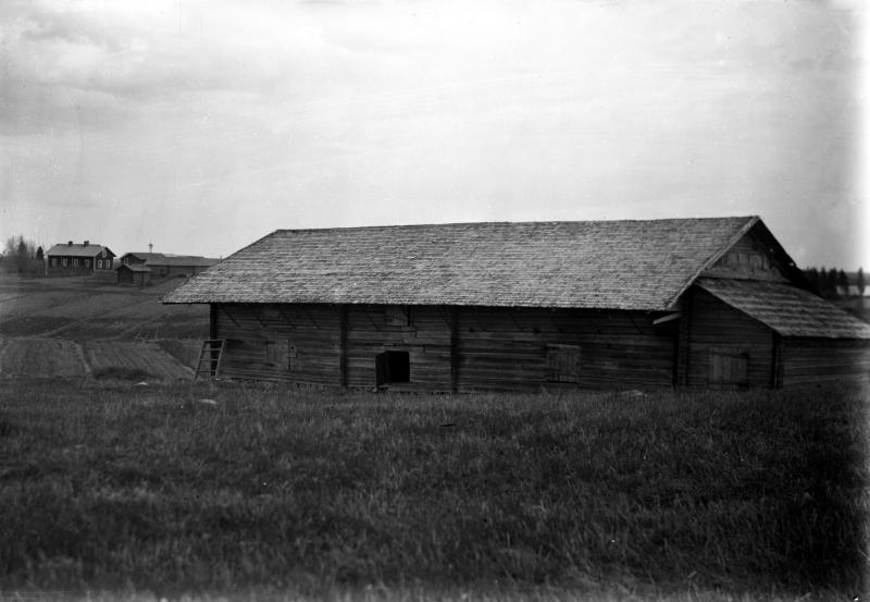 Ylimäen talon riihirakennus Mäkikylässä, Hakojärvellä. Takaa vasemmalta näkyy Mäkirannan talot Valokuvaaja Heikki Heikkola