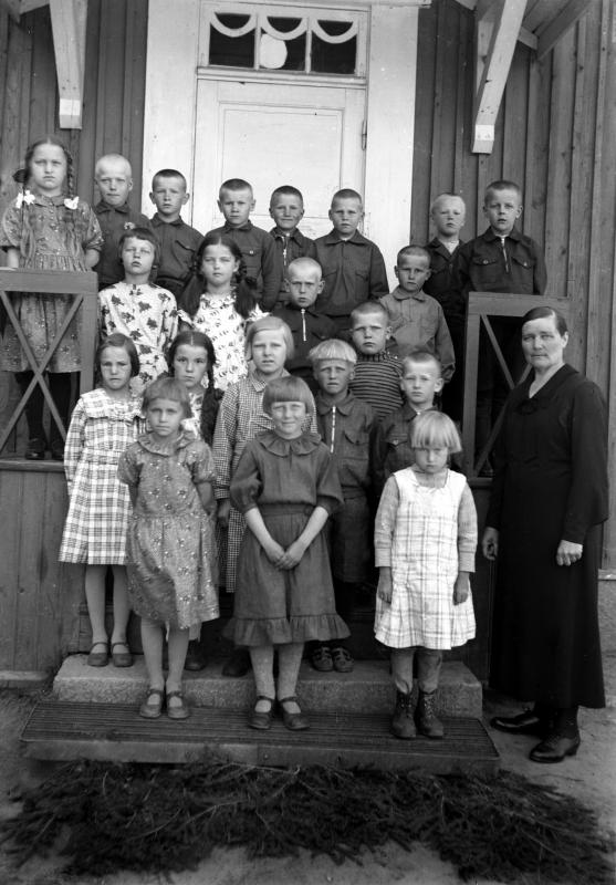 Töysän aseman koululaisia, opettaja Mimmi Katajamäki, kuvassa ed. vas. Lilja Mansikkamäki (os. Hiipakka), vas toinen rivi Toini Ylimäki, Kerttu Lavila (os. Katajamäki), muita Pauli Kortesmäki, Paavo Katajamäki, Leo Peurala Valokuvaaja Heikki Heikkola