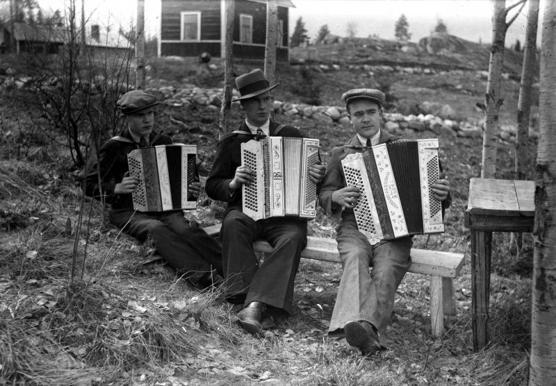 Haitarinsoittajat ennen sotia Hakojärvellä, vas. Arvo Kotiranta, Armas Haveri ja Aimo Ollikainen Valokuvaaja Heikki Heikkola