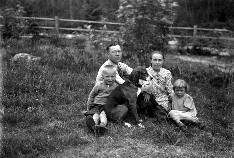 Artturi Mäkiranta Impi Mäkiranta os Rankila lapset Matti Mäkiranta ja Ulla-Maija Uusimäki os Mäkiranta ...koiran nimi Tuli Valokuvaaja Verner Vanhamäki