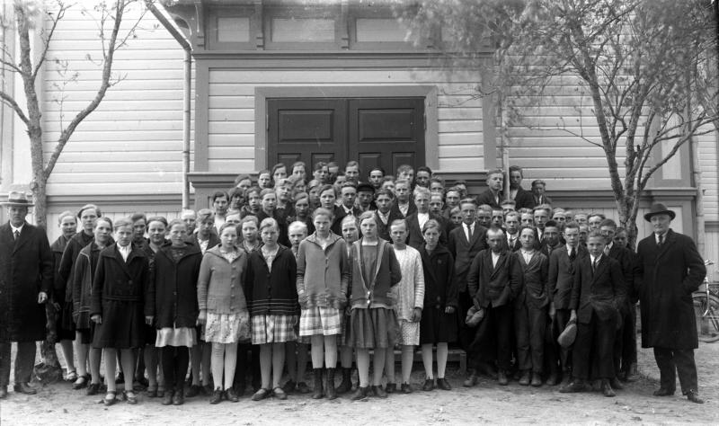 Rippikoululaisia Töysän kirkon edessä, vas. kirkkoherra Väinö Tuomola