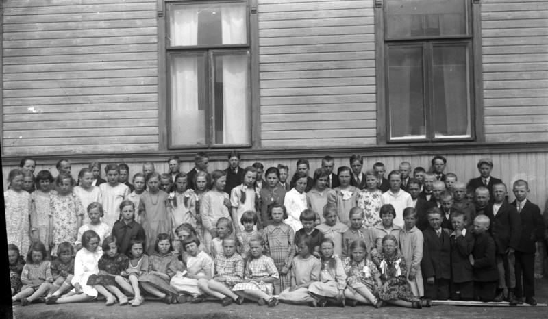 Koululaisia kirkonkylän kansakoululla. vas. opettajat Aino Åkerman ja Juho Hakala Valokuvaaja Verner Vanhamäki