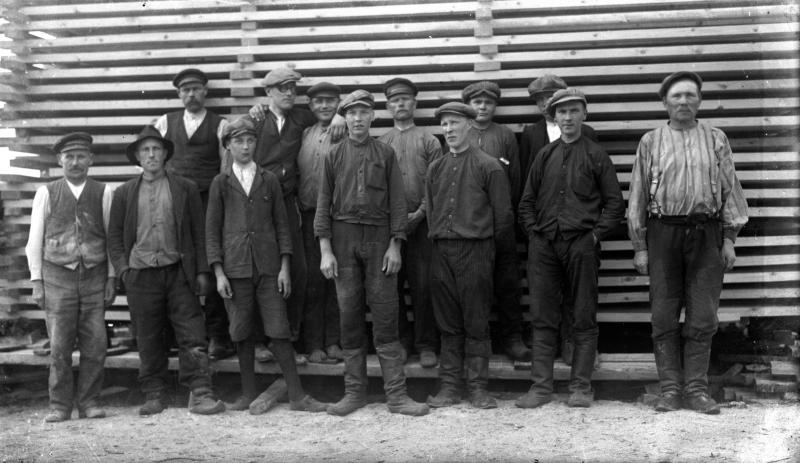 Toivolan sahan = Akonkoski työmiehiä. Ens. vas. Juho Toivola, ens. oik. Jaakko Hakala, edessä 3. oik. Erkki Saarimäki Valokuvaaja Verner Vanhamäki