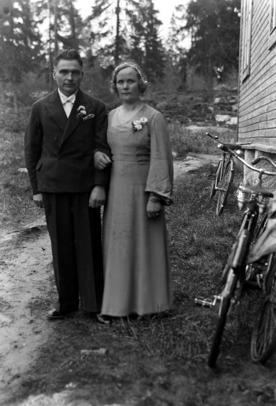 Vihkipari Lempi (os. Korpela) ja Heikki Lamminniemi 30.5.1936. Heikki oli suutari. Valokuvaaja Heikki Heikkola