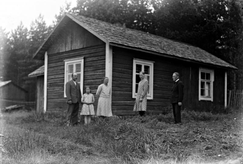 Heikki, Kerttu ja Fiinu Kuivasmäki, Lyydia ja Väinö Kontoniemi. Talo Suomelan takana, ompelija Hilja Kuivasmäen omistama. Valokuvaaja Heikki Heikkola