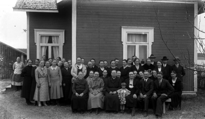 Peltolan tilan talon päädystä otettu kuva, Laila Tuomola, Ester Salonen, Hilda Penttilä, Aino Herrala, Elli Paavola, Jenny Louhela, Lyydi Toivola, Iita Hakomäki, Fanni Koskimaa, Tiila Peltola, Herman Louhela, Gertti Manner Valokuvaaja Heikki Heikkola