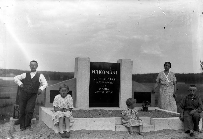 Kustaa Hakomäki perheensä kanssa vanhempiensa haudalla