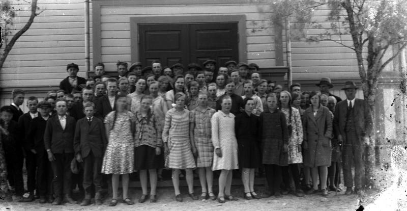 Rippilapsia Töysän kirkon portailla, oik. kirkkoherra Väinö Tuomola