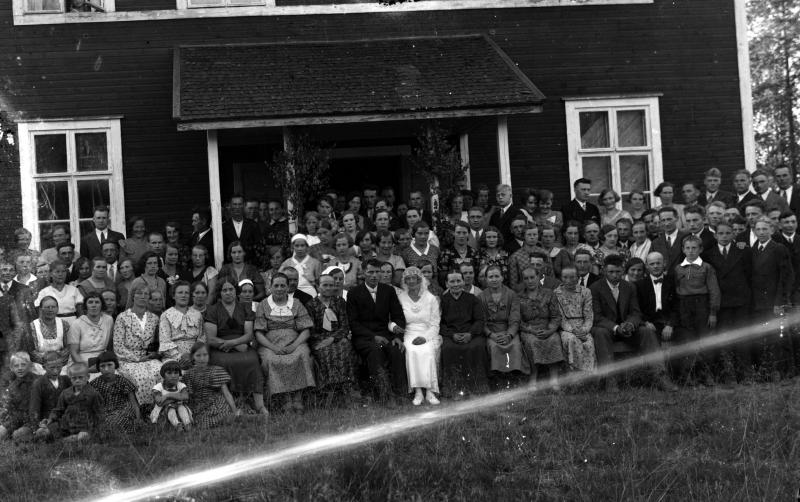 Eino Lamminahon ja Elsa Korkeamäen häät 4.8.1934 Hakojärvellä raittiusyhdistyksen talolla. Valokuvaaja Heikki Heikkola
