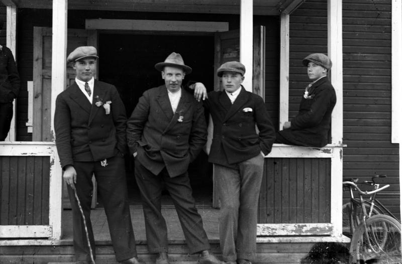 vas. Eino Lamminaho, Matti Heikkola, Eino Myllyaho ja Usko Mäkiranta, kuva otettu Hakojärvellä raittiusyhdistyksen talolla Valokuvaaja Heikki Heikkola Kuvakoko 83x120