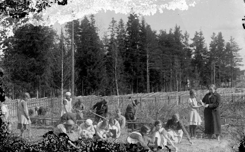 Töysän aseman koulun oppilaita kasvimaalla. Opettaja Sally Taimio os. Lehtonen Valokuvaaja Heikki Heikkola Kuvakoko 83x140