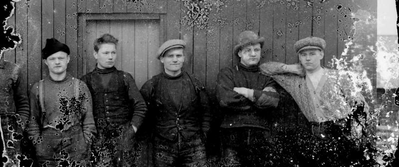 Eino Heinämäki, Eino Lamminaho, Eino Niemelä, Kalle Peltoniemi, Väinö Salmenaho. Suutari Oskari Virtasen työmiehiä. Valokuvaaja Heikki Heikkola Kuvakoko 90x120