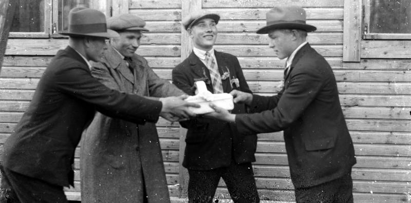 Vas. Eino Lamminaho, Verner Vanhamäki, Onni Lamminaho ja Artturi Ylimäki Valokuvaaja Heikki Heikkola Kuvakoko 90x120