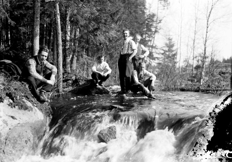 Vas. Verner Vanhamäki, oikealla istumassa Eino Lamminaho. Hakojärvellä Jouttilammen myllypadolla Valokuvaaja Heikki Heikkola