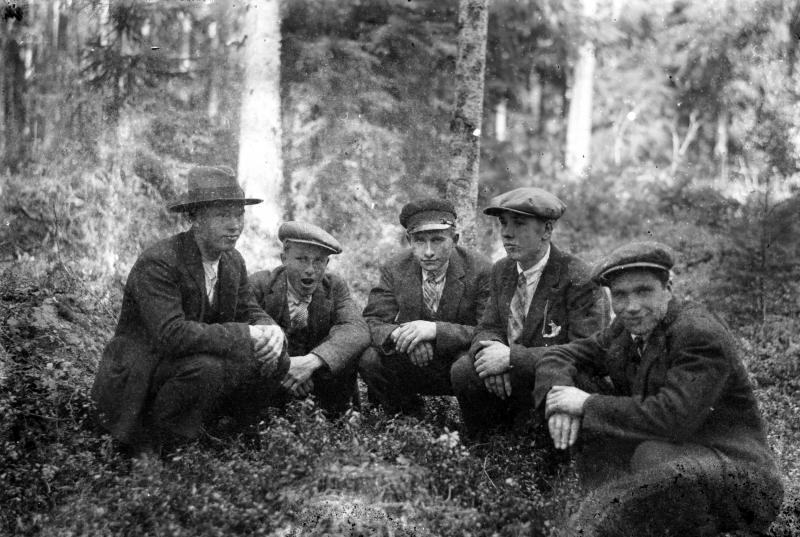 Hakojärveläisiä nuoria miehiä oik. Verner Vanhamäki, Onni Lamminaho, Eino Myllyaho, ?, Eino Lamminaho Valokuvaaja Heikki Heikkola