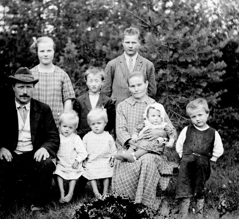 Pykälämäet: Juho ja Hilda (os. Autio) Pykälämäki, takana Lyyli (myöh. Kosola), Matti ja Toivo, kaksoset Aaro ja Arvo, sylissä Eero, oikealla Eino Valokuvaaja Heikki Heikkola