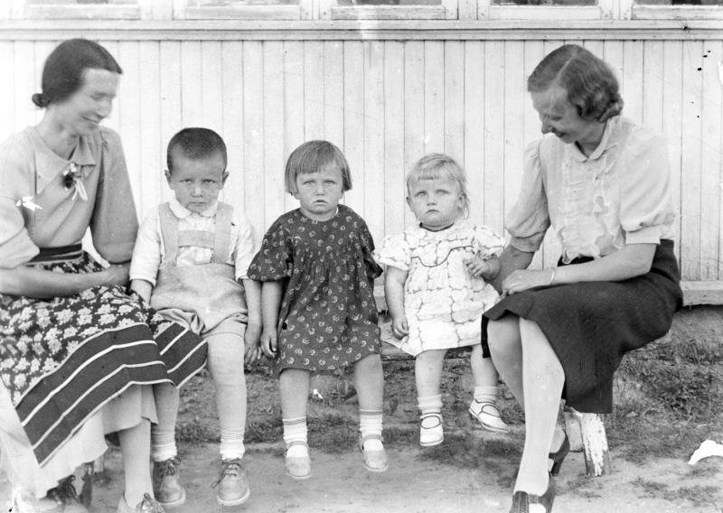 Paavolan sisarukset lapsineen Helli Pirttimäki, lap. Olavi Taavetti 28.7.1936, Liisa Kaarina s. 18.12.1937, Eeva Kukkola s. Paavola, Irma Marjatta s. 21.12.1938 myöh. Harju Valokuvaaja Heikki Heikkola