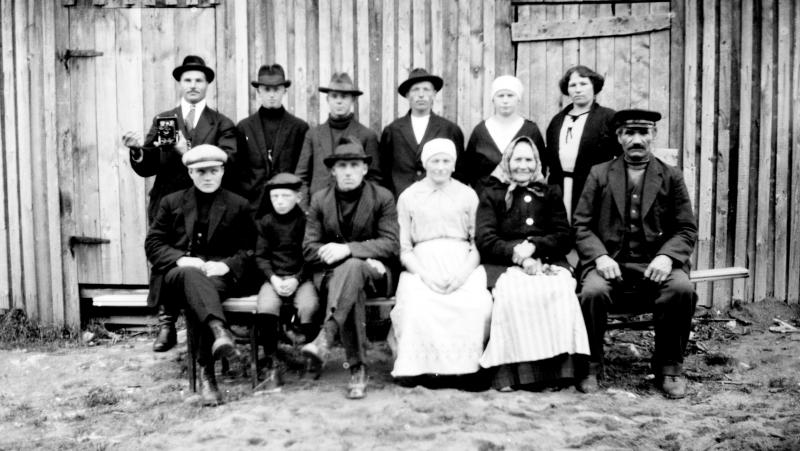 Vanhamäen perhe kyläilemässä Kemissä Hartikaisen perheen luona. Edessä oik. ist. Nikodemus ja Liisa Vanhamäki, heidän takanaan seisomassa Lyydia Vanhamäki. Oikeassa reunassa Heikki Rintala, Verneri Vanhamäen veli. Verneri Vanhamäki kuvaajana.