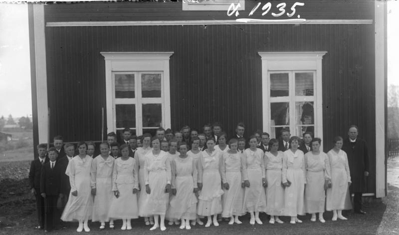 Oik. Kirkkoherra Väinö Tuomola, kuvassa tunnistettu mm. Kerttu Raiski myöh. Mursula, 1935 vuoden rippikoulaiset