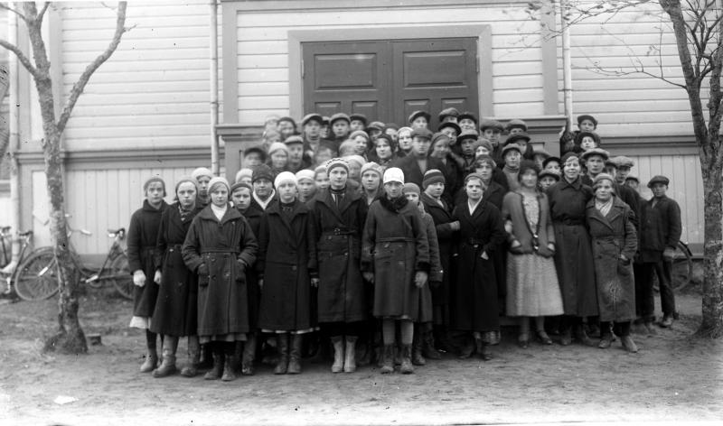 Rippikoululaisia 1923 -syntyneitä Töysän kirkon portailla, kuvassa mm. Rauha Niemi os. Kosola s. 1923. Valokuvaaja Verner Vanhamäki