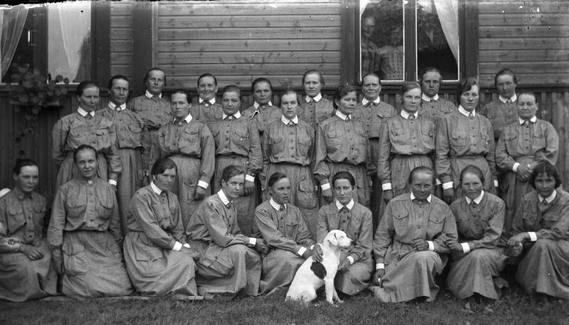 Eturivi 5. vas. Hilma Koskenaho, 1. oik. Gertti Manner, takarivi 1. oik. Hilma Paavola, 3.Saima Aho, 6. Liisa Herrala, 7. Fanni Paavola, 8. Elli Paavola, 10. Hilda Penttilä, 11. Hilma Riihimäki, ikkunasta katsoo Anni Herrala Valokuvaaja Verner Vanhamäki