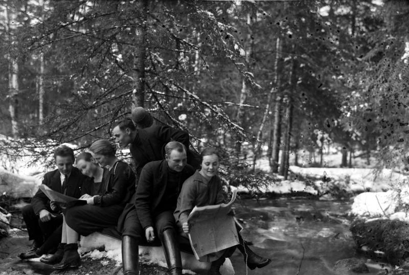 Takana Heikki Heikkola, oik edessä Elli Heikkola, toinen oikealta Konsta Tyrni, ?, vasen Leonard Vilppula, Hilma Heikkola, ? Valokuvaaja Heikki Heikkola