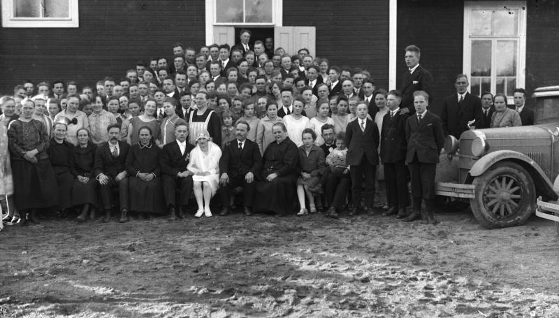 Lauri Virtasen ja Hilda Isomäen häät 17.5.1929. Morsiamen oikealla puolella Oskari ja Sanna Virtanen. Sulhasen vasemmalla puolella morsiamen vanhemmat Isomäet. Valokuvaaja Heikki Heikkola