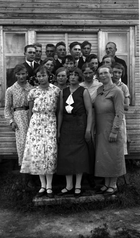 oik. Anni Myllykoski, oik. Sulo Rasinperä, oik, Vilho Huutoniemi toinen rivi Lyyli Huutoniemi, kesk. edes Irja Kiviaho, Maiju Vuorenmaa, kesk. Uuno Myllykoski, Valokuvaaja Heikki Heikkola