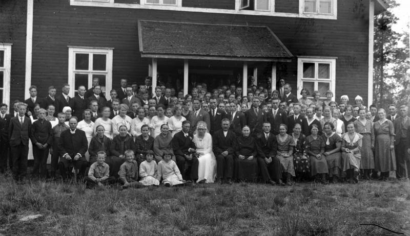 Santeri Pennalan ja Esteri Lamminahon häät Raittiusyhdistyksen talolla Hakojärvellä. Valokuvaaja Heikki Heikkola