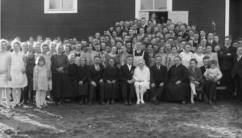 Lauri Virtasen ja Hilda Isomäen häät 17.5.1929. Morsiamen oikealla puolella Oskari ja Sanna Virtanen. Sulhasen vasemmalla puolella morsiamen vanhemmat Isomäet. Valokuvaaja Verner Vanhamäki
