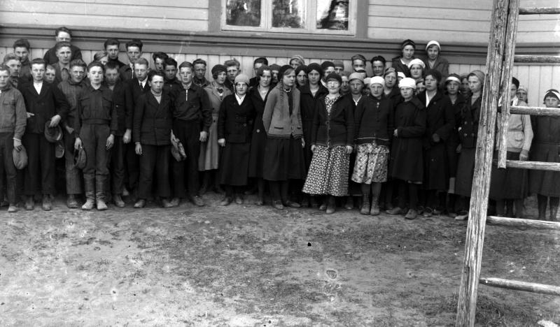 Rippikoululaisia Töysän kirkon seinustalla. Kuvassa mm. Katajamäki Vilho, Lyyli Huutoniemi, Rauha Hakola, Hilkka Hiipakka, 1933? Valokuvaaja Verner Vanhamäki