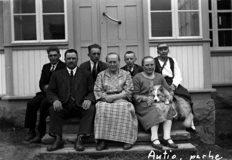 Vas. Kustaa Laurila, keskellä Maria Autio (os. Rankila), koira sylissään Marian tytär Impi (Kustaan vaimo), takana Hilma Pennala? (Hirvelä) ja miehensä Toivo Hirvelä? (Hirvimäki) sekä heidän poikansa Ossi?.