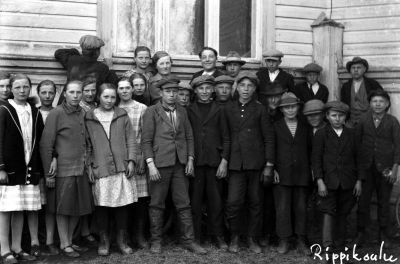 Rippikoululaisia 1911-1912 syntyneitä kirkon nurkalla. Kuvassa mm. seitsemäs oik. Onni Mäkiranta synt. 1911, toinen vas. Vieno Hauta-aho synt. 1912. Valokuvaaja Heikki Heikkola