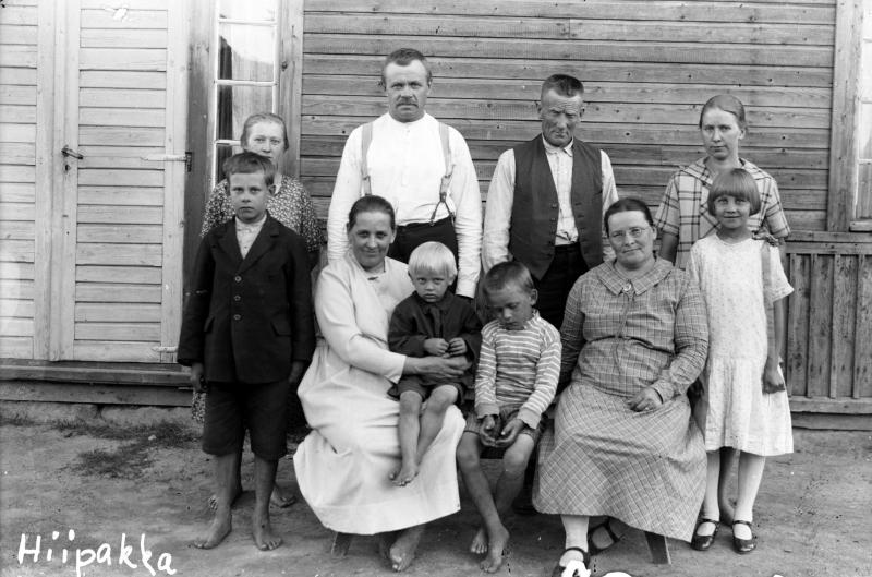 Vas. edestä Mauri, Hilma, Jalo ja Veikko Hiipakka, Elsa Ahomäki os. Rönn, Hilkka Hiipakka. Vas. takaa Elsa Lamminaho os. Korkeamäki, Konstu Hiipakka, Kustaa Ahomäki ja Fanni Korkeamäki Valokuvaaja Heikki Heikkola