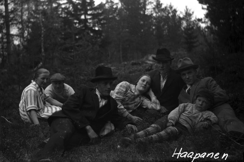 Hilda ja Santeri Haapanen, Kalle, Hilda, Väinö ja (edessä) Martti Rankila, Martin takana Reino Haapanen. Valokuvaaja Heikki Heikkola