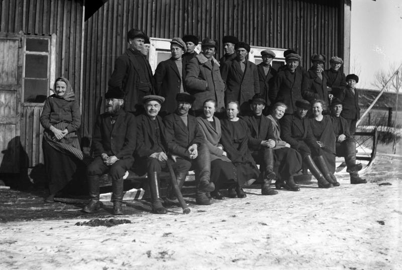 Puunajajia ja talon väkeä Ähtärin Nousunniemen talon edessä. Miehet ajoivat puita Pihlajavedelätä asemalle. Kuvassa vasemmalla Maria Nousuniemi (1840-1939) Puunajossa oli töysäläisiä mukana, mm. Aleksi Panula ja Verner Vanhamäki. Kuva Vanhamäen kameralla otettu.