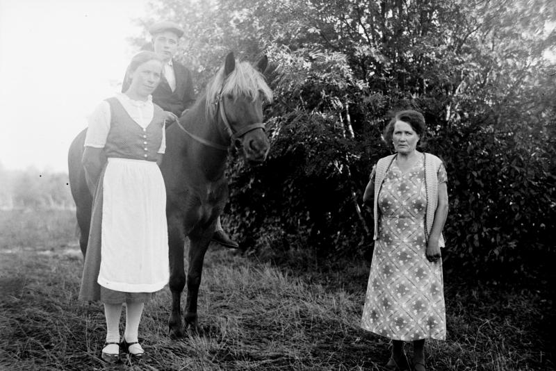 Hevosen selässä Unto Kuivasmäki, Hilja Kuivasmäki, vas. Martta Pykälämäki Valokuvaaja Verner Vanhamäki