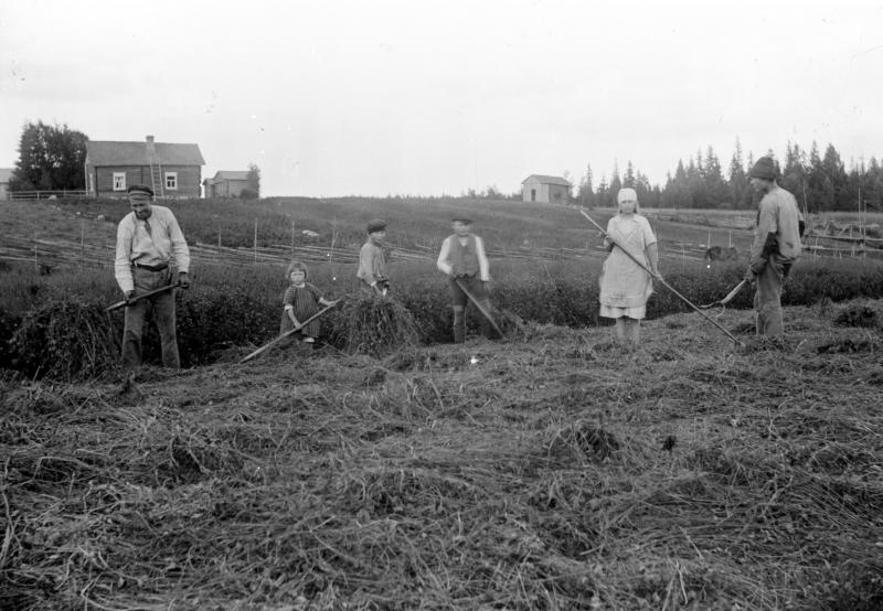 Lamminahon pellolla, Juho, Mirjam Lamminaho, Lähteenmaa Toivo?, Toivo, Heidi, Eino Lamminaho, Taustalla Vanhamäen talo. Hakojärvi Valokuvaaja Verner Vanhamäki