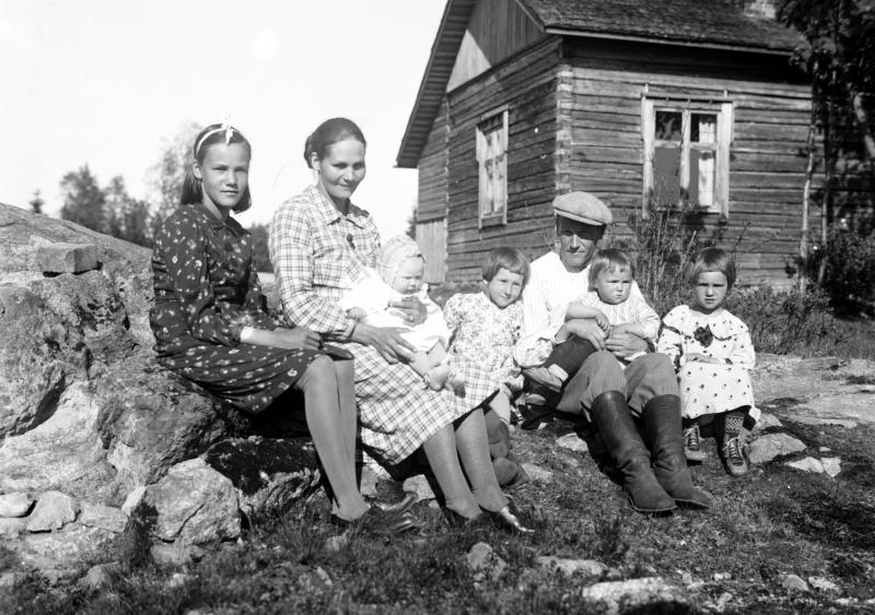 Vas. Toini, Lyydia, Liisa sylissä, Rauha, Aarno, Eeva, Aune Ylimäki, Kuvattu kesällä 1940 Valokuvaaja Verner Vanhamäki